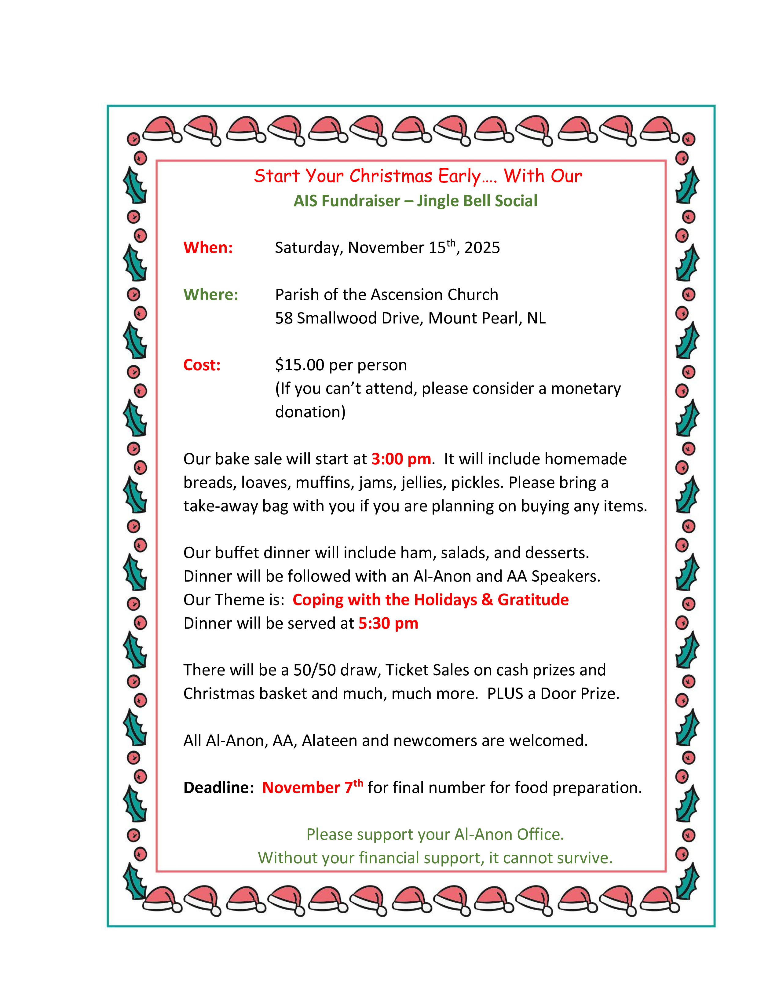 - Nov 15, 2025 Jingle Bell Social - see the flyer below. All welcome to join us for fun and fellowship! Let your GR know that you'd like to attend, along with your $15, by Nov 7 to give the organizers time to prepare. There will be a delicious meal, a bake sale, crafts, a 50/50 draw and spins. Following the meal there will be AA and an Al-Anon speaker. This is always a great event to meet Al-Anon friends old and new, and to help prepare for the holidays. Hope to see a "fine crowd".